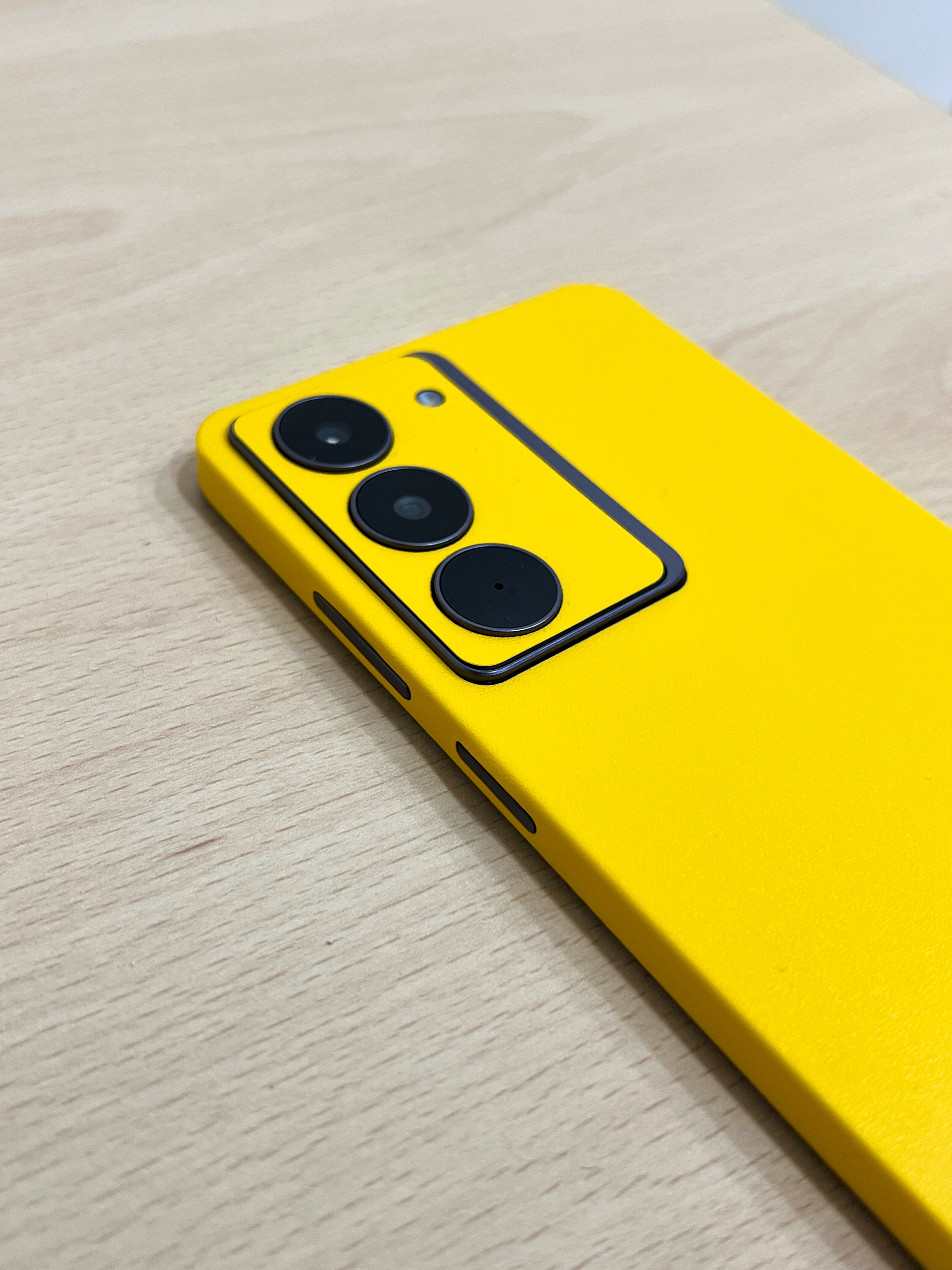 You can clean your skin-covered Realme 14x with a damp cloth. Avoid using harsh chemicals or abrasive materials.